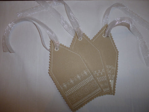 Colour is Hessian with winter white embroidery and the size is approx 2 3/4"wide x 5 1/2" long (7cm x 14cm)